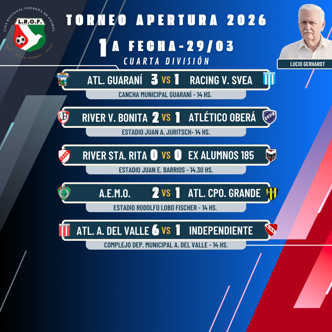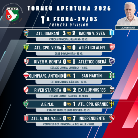 Este domingo se disputó la primera fecha del torneo Apertura 2026 “Lucio Gerhardt”, donde se registraron un total de 20 goles y no hubo ningún empate en Primera División.