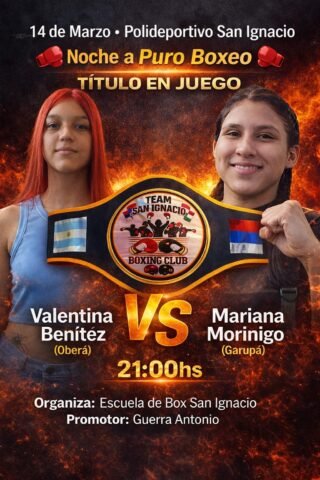 En el cuadro femenino, la obereña Valen Benítez combatirá ante Mariana Morinigo, de Garupá, en una pelea con título en juego. A su vez, Belu “Maravilla” Pérez, también de Oberá, se medirá con Sol Silveira, de Puerto Iguazú, en otro de los cruces destacados de la programación.