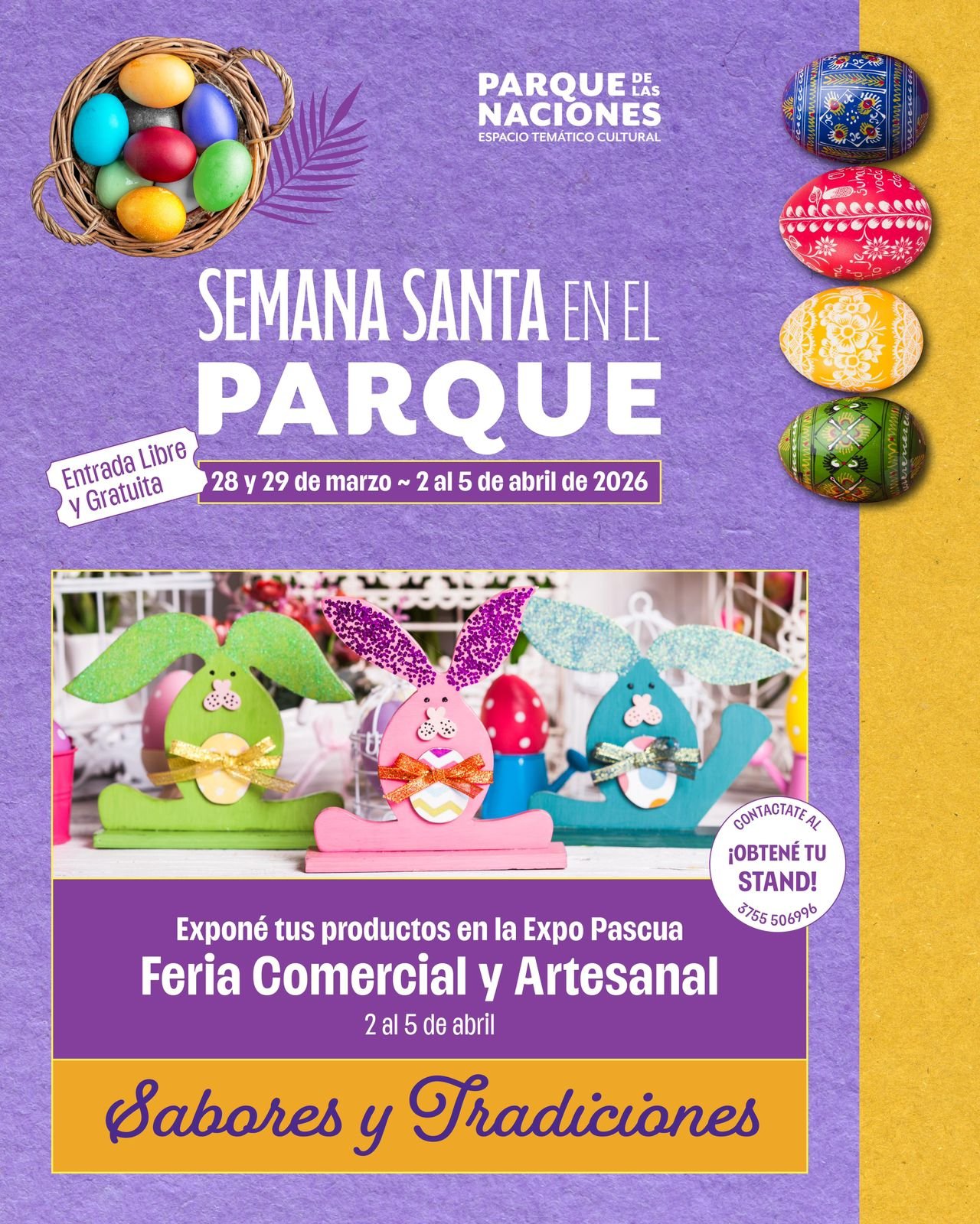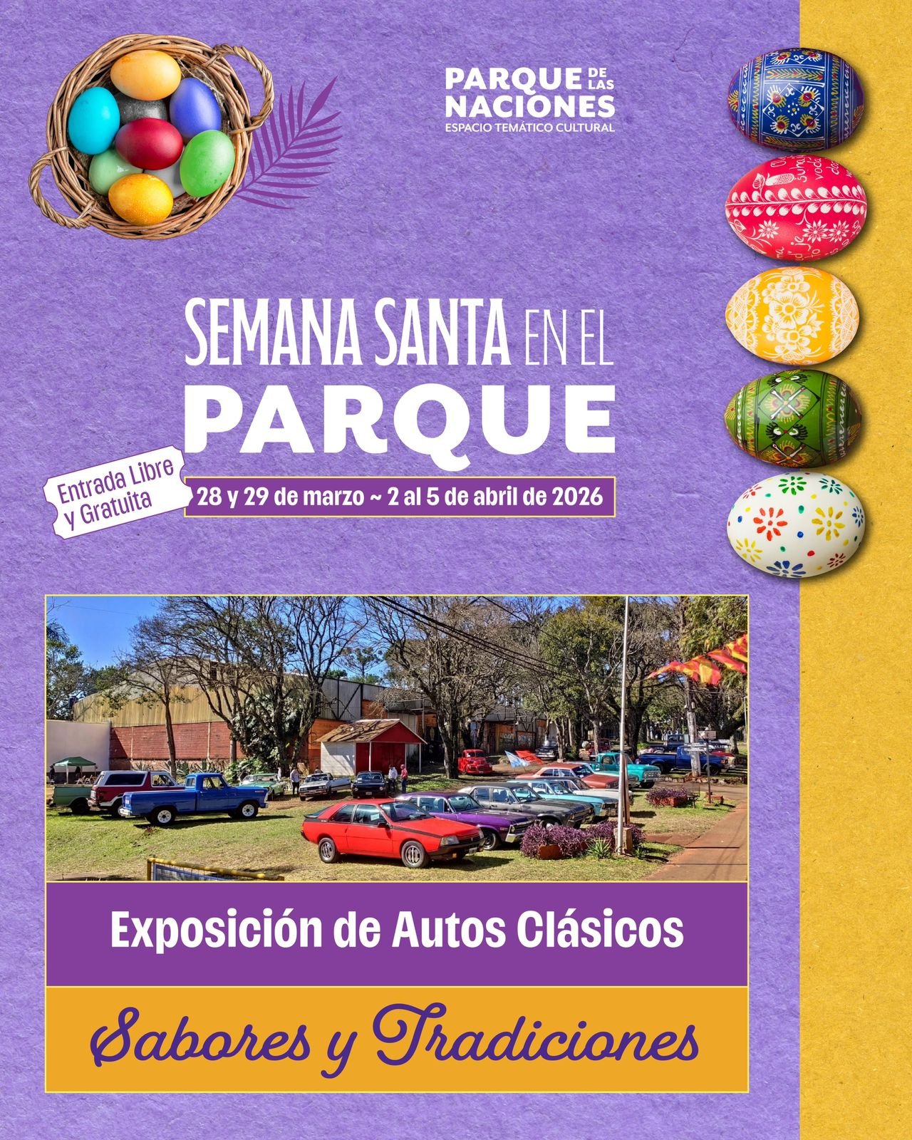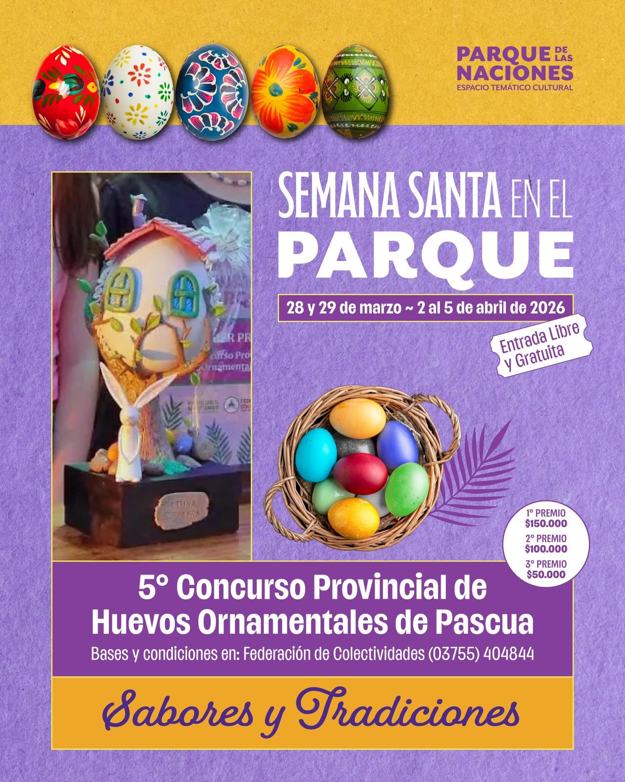 • 5° Concurso Provincial de Huevos Ornamentales de Pascua: Una de las grandes atracciones visuales. Los artistas locales competirán por premios de hasta $150.000. La premiación se realizará el sábado 04/04 a las 17:30 hs frente a Marca Parque.