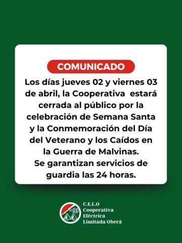 La Cooperativa Eléctrica Limitada de Oberá (CELO) comunicó que sus oficinas permanecerán cerradas los días jueves 2 y viernes 3 de abril, en el marco de Semana Santa y la conmemoración del Día del Veterano y de los Caídos en la Guerra de Malvinas.