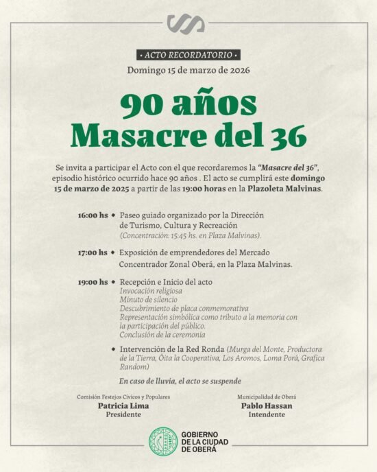 La ciudad de Oberá realizará el próximo domingo 15 de marzo de 2026 el acto recordatorio por los 90 años de la “Masacre del 36”, un hecho histórico que forma parte de la memoria de la comunidad.