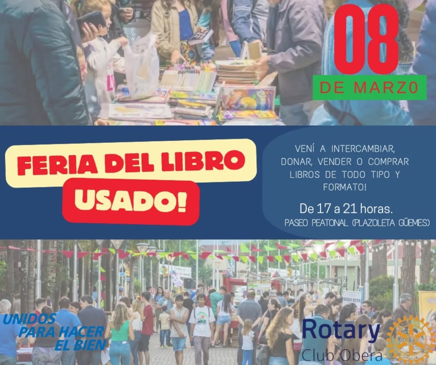 Uno de los atractivos centrales será la presencia del Rotary Club Oberá, que llevará adelante la 15ª edición de la Feria del Libro Usado. La iniciativa invita a darle una segunda vida a libros ya leídos y, al mismo tiempo, a descubrir nuevas lecturas. Se podrán intercambiar, vender o comprar ejemplares de segunda mano, desde novelas hasta manuales escolares nuevos y usados, además de fotocopias.