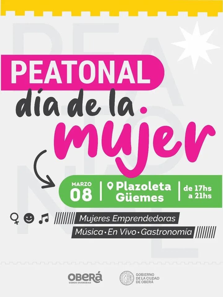 La ciudad de Oberá se prepara para una nueva edición de la Peatonal Cultural, que en esta oportunidad se realizará en el marco del Día Internacional de la Mujer. La actividad tendrá lugar este domingo 8 de marzo en la Plazoleta Güemes, entre las 17 y las 21 horas, con una propuesta pensada para celebrar, acompañar y visibilizar el talento y la fuerza de las mujeres.