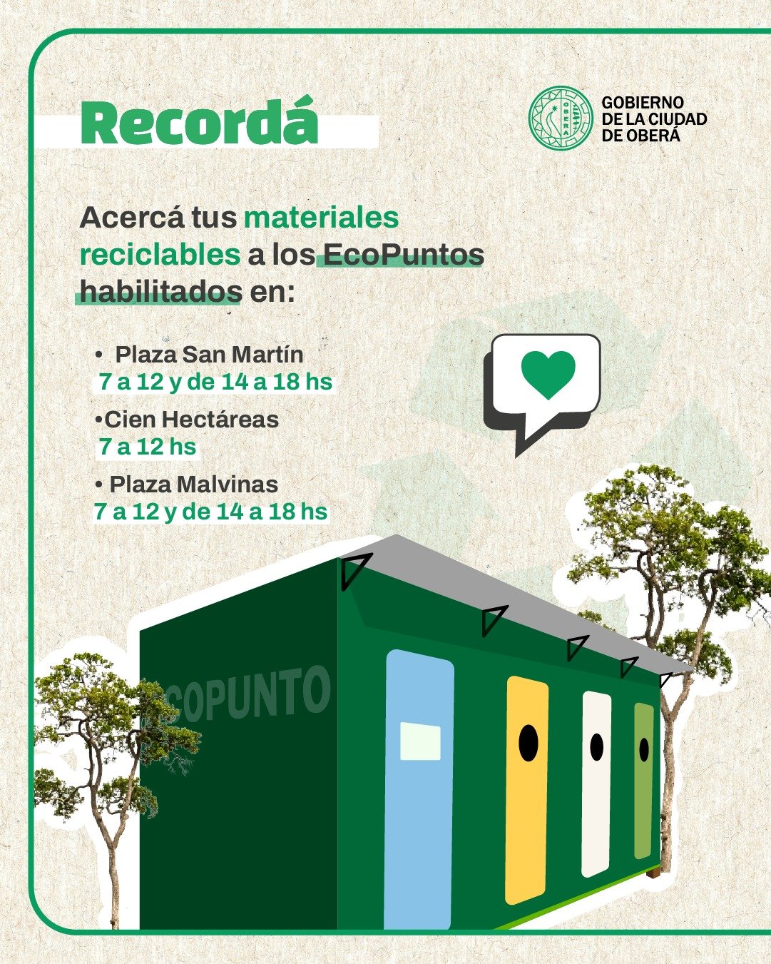 Para fomentar la separación y el reciclaje, el municipio cuenta con EcoPuntos donde los vecinos pueden acercar sus materiales reciclables. Los mismos funcionan en Plaza San Martín, de 7 a 12 y de 14 a 18 horas; en Cien Hectáreas, de 7 a 12 horas; y en Plaza Malvinas, de 7 a 12 y de 14 a 18 horas.