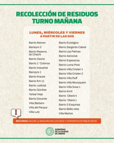 Desde el Gobierno de la Ciudad de Oberá solicitan a la comunidad sacar la basura únicamente en los días y horarios establecidos, con el objetivo de mantener la ciudad limpia y facilitar el trabajo del personal encargado del servicio.