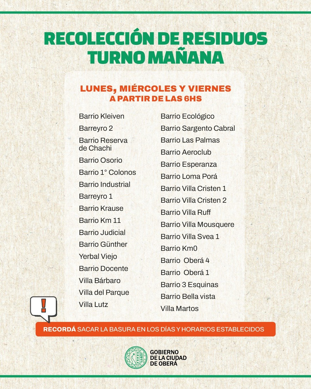 El servicio de recolección de residuos domiciliarios los lunes, miércoles y viernes desde las 6 horas abarca los barrios Kleiven, Barreyro 2, Reserva de Chachi, Osorio, 1° Colonos, Industrial, Barreyro 1, Krause, Km 11, Judicial, Günther, Yerbal Viejo, Docente, Villa Bárbaro, Villa del Parque, Villa Lutz, Ecológico, Sargento Cabral, Las Palmas, Aeroclub, Esperanza, Loma Porá, Villa Cristen 1, Villa Cristen 2, Villa Ruff, Villa Mousquere, Villa Svea 1, Km 0, Oberá 4, Oberá 1, 3 Esquinas, Bella Vista y Villa Martos.