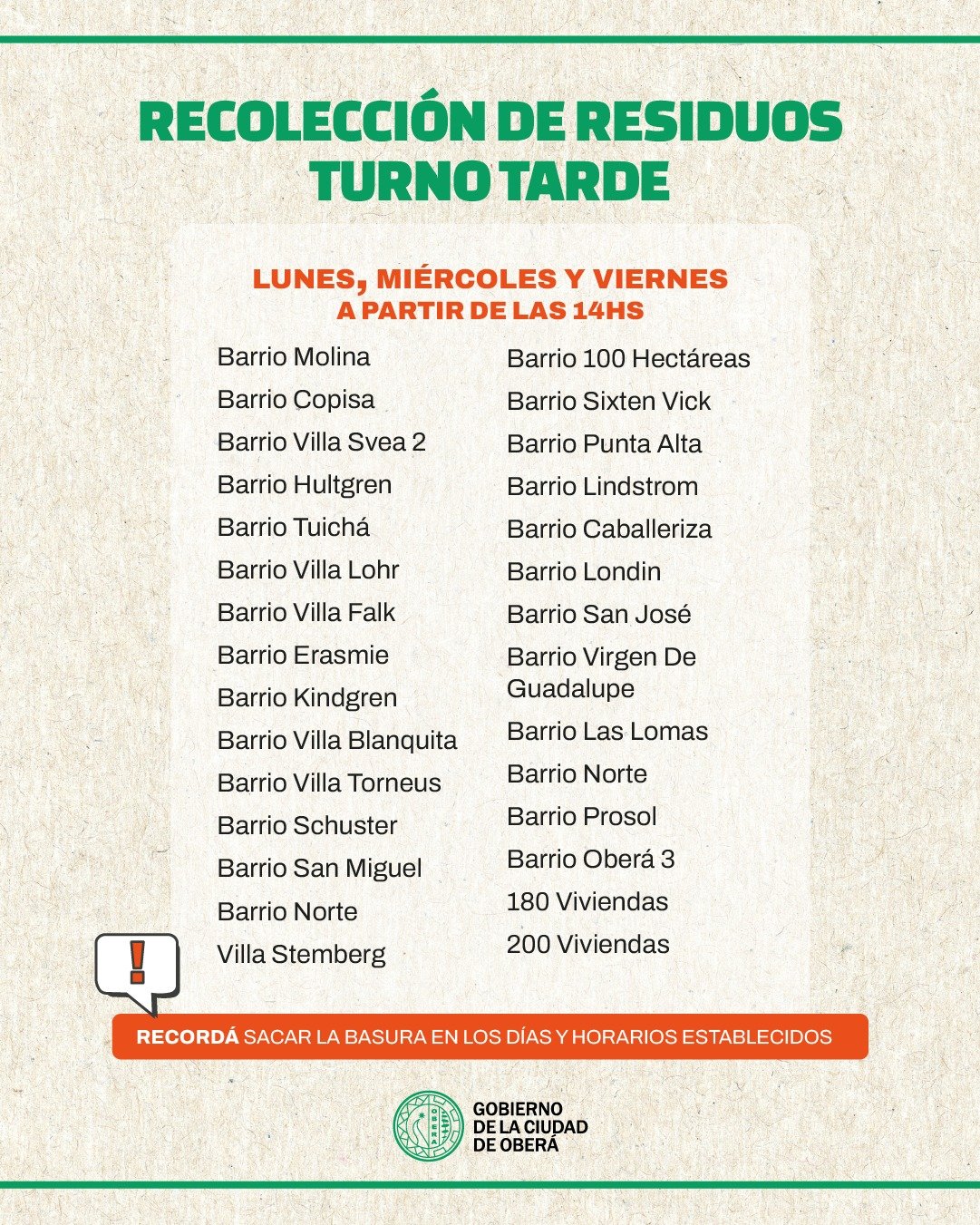 En tanto, el turno tarde se realiza los lunes, miércoles y viernes a partir de las 14 horas, en los barrios Molina, Copisa, Villa Svea 2, Hultgren, Tuichá, Villa Lohr, Villa Falk, Erasmie, Kindgren, Villa Blanquita, Villa Torneus, Schuster, San Miguel, Norte, Villa Stemberg, 100 Hectáreas, Sixten Vick, Punta Alta, Lindstrom, Caballeriza, Londin, San José, Virgen de Guadalupe, Las Lomas, Prosol, Oberá 3, además de los sectores 180 Viviendas y 200 Viviendas.