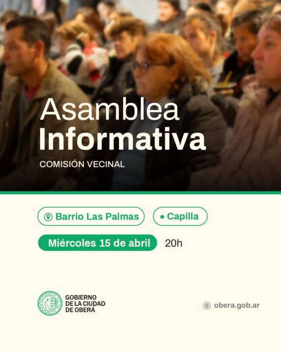 Desde el Gobierno de la Ciudad de Oberá convocan a los vecinos del Barrio Las Palmas a participar de la asamblea informativa sobre el proceso de elecciones para la conformación de autoridades de la Comisión Vecinal.