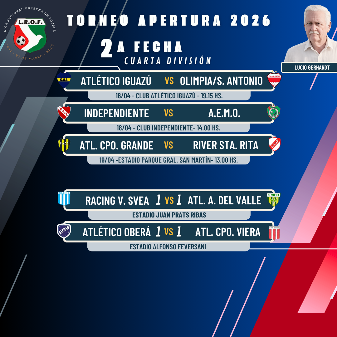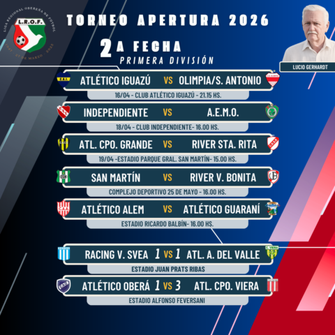 Luego de que el domingo se disputara un solo partido correspondiente a la 2ª fecha del torneo Apertura 2026 “Lucio Gerhardt”, con el empate entre Racing y Atlético Aristóbulo del Valle, y este martes con la victoria de Atlético Campo Viera ante Atlético Oberá, el resto de los partidos se irán disputando entre este jueves y el fin de semana, aunque habrá dos choques que seguirán pendientes.