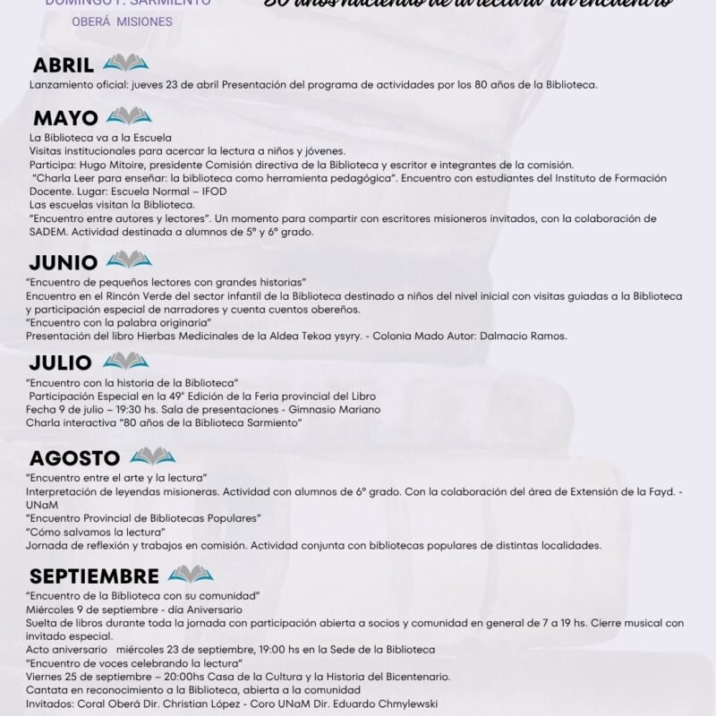 La Biblioteca Popular Domingo Faustino Sarmiento lanzó oficialmente el cronograma de actividades por su 80° aniversario, en el marco de una conferencia realizada recientemente en Oberá. Bajo el lema “80 años de historias, y la próxima la escribimos juntos”, la institución invita a la comunidad a ser parte activa de una celebración que se extenderá durante varios meses.