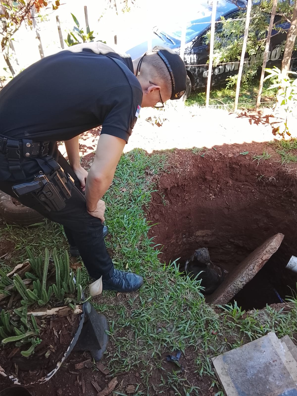 Al llegar, los policías constataron que el animal se encontraba atrapado en el interior de la excavación, por lo que iniciaron un operativo de rescate que permitió extraerlo sin lesiones visibles.
