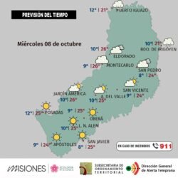 La Dirección General de Alerta Temprana anticipa jornadas frescas y algo nubladas para el miércoles y jueves, con lluvias aisladas en el norte provincial. El viernes regresará el sol y se espera un marcado ascenso de las temperaturas en todo el territorio misionero.
