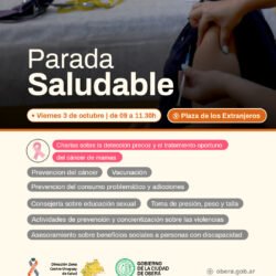 Mañana viernes 3 de octubre en el marco del mes de la detección temprana y tratamiento oportuno del cáncer de mamas, se realizará una nueva edición de Parada Saludable.