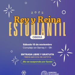 La Elección Departamental de Rey y Reina Estudiantil Oberá 2025 se llevará a cabo el sábado 15 de noviembre, a partir de las 19 horas, en el Complejo Ian Barney II.