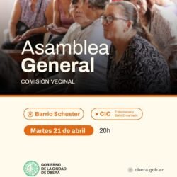 El Gobierno de la Ciudad de Oberá convoca a los vecinos de los barrios Villa Ruff, Bella Vista, Villa Barreyro, Schuster y Las Palmas a participar de las asambleas generales, en el marco del proceso de elecciones para la conformación de las nuevas autoridades de las Comisiones Vecinales.
