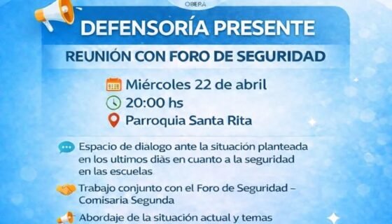 El encuentro se realizará el miércoles 22 de abril, a las 20, en la Parroquia Santa Rita. La convocatoria surge a partir de la preocupación generada en los últimos días por hechos vinculados a la seguridad en establecimientos educativos.